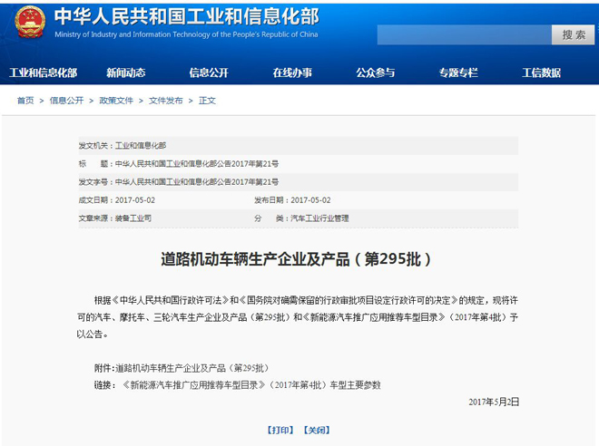根據(jù)《中華人民共和國行政許可法》和《國務(wù)院對確需保留的行政審批項(xiàng)目設(shè)定行政許可的決定》的規(guī)定,現(xiàn)將許可的汽車、摩托車、三輪汽車生產(chǎn)企業(yè)及產(chǎn)品(第295批)和《新能源汽車推廣應(yīng)用推薦車型目錄》(2017年第4批)予以公告。